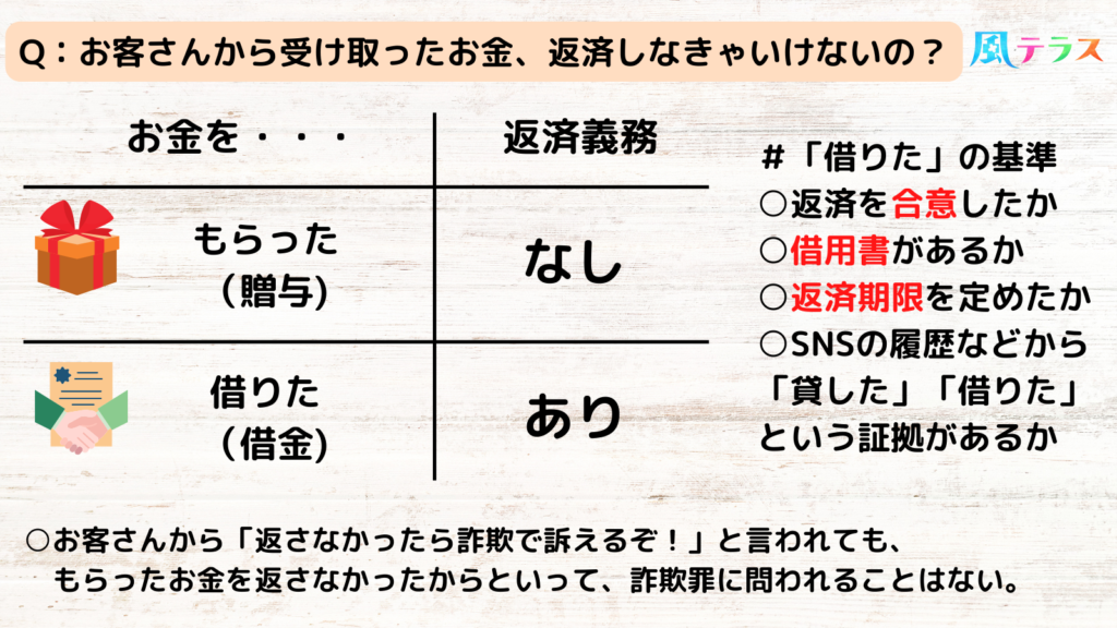 店外でお客さんから受け取ったお金は、「もらった」ものであれば返済の必要はありません。詐欺罪になることもありません。 ・・・が、なかには感情的になって採算度外視で訴えてくる&ストーカー化する男性もいるので、店外の誘いには最初から応じないこと... -