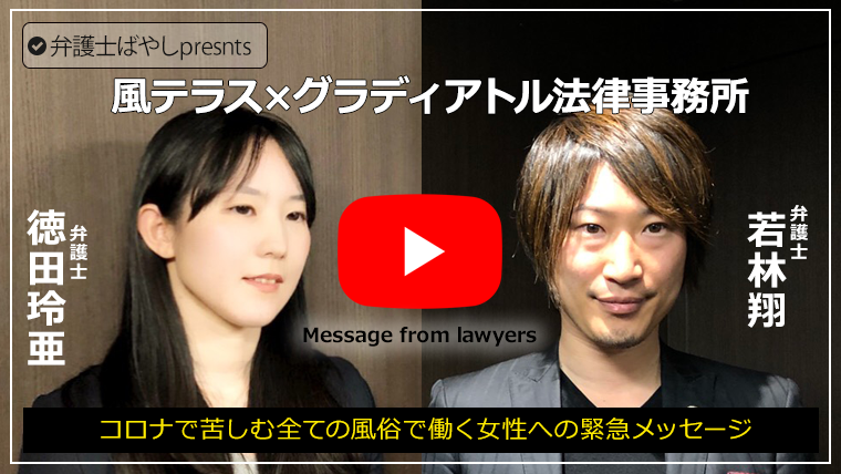 風テラスの徳田弁護士と、性風俗業界に精通するグラディアトル法律事務所の若林弁護士による動画がYouTubeにて公開されました! 風俗で働く女性が、困った時にどこに行って、何をすればいいのか、分かりやすく解説しておりますので、ぜひご覧ください。 ☆... -
