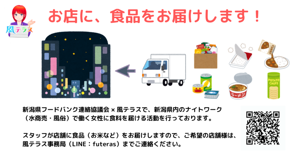 新潟県フードバンク連絡協議会と風テラスが連携して、新潟県内でナイトワークをしている女性の中で、新型コロナの影響で生活に困っている方々を対象として、食料支援を行う事業を開始いたしました。 写真:フードバンクあがの山田さん(左)、風テラス坂爪...