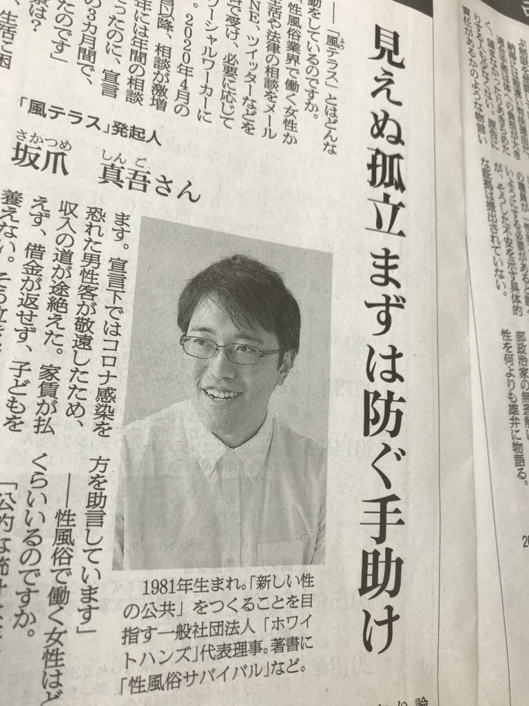 6月1日(火)朝日新聞朝刊13面交論「社会の中の性風俗業」にて、風テラス発起人の坂爪が意見を述べております。 「性風俗廃止」を訴える藤田孝典さんとの議論、ぜひお読みください! ⇒朝日新聞デジタルでもお読み頂けます。